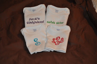 Each time a local client brings me a garment to monogram or applique I cannot wait to get started... the possibilities are endless. Here are a couple of things that my good friend brought to me to complete for a baby gift. She wanted something special to add to a gift basket she had created for a second baby. So exciting...