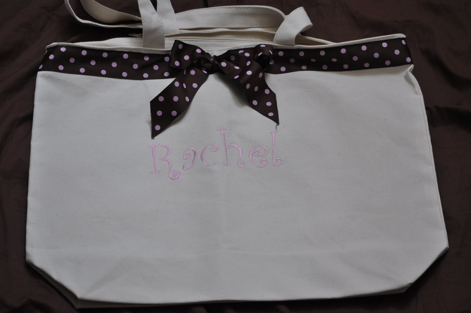 I love this gift... it is so cute and personal. Both Doodles and Sweetpea had a bag just like this... I love to pack it when we were going out for the day or on a trip. You can fill it to the brim with extra diapers, wipes and several changes of clothes or with just a few items. Each bag is personalized with your choice of font, different ribbon and matching tread color. It is hard to go wrong with a great bag like this.